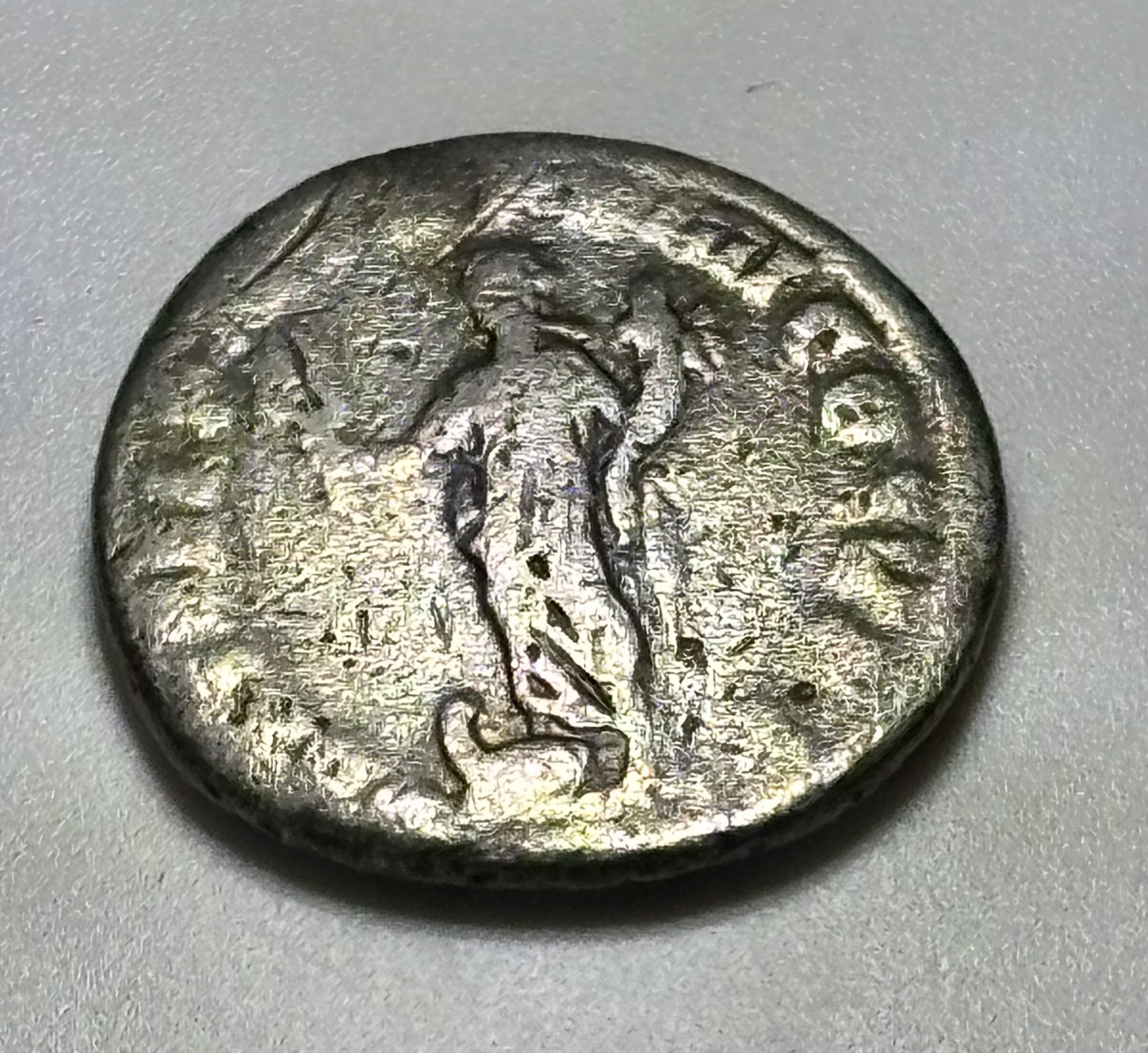 Ein Denar aus der frühen Regierungszeit des Commodus. Das Porträt zeigt den jungen Kaiser mit markanten Gesichtszügen, während die Rückseite ein klassisches Motiv der kaiserlichen Propaganda darstellt.