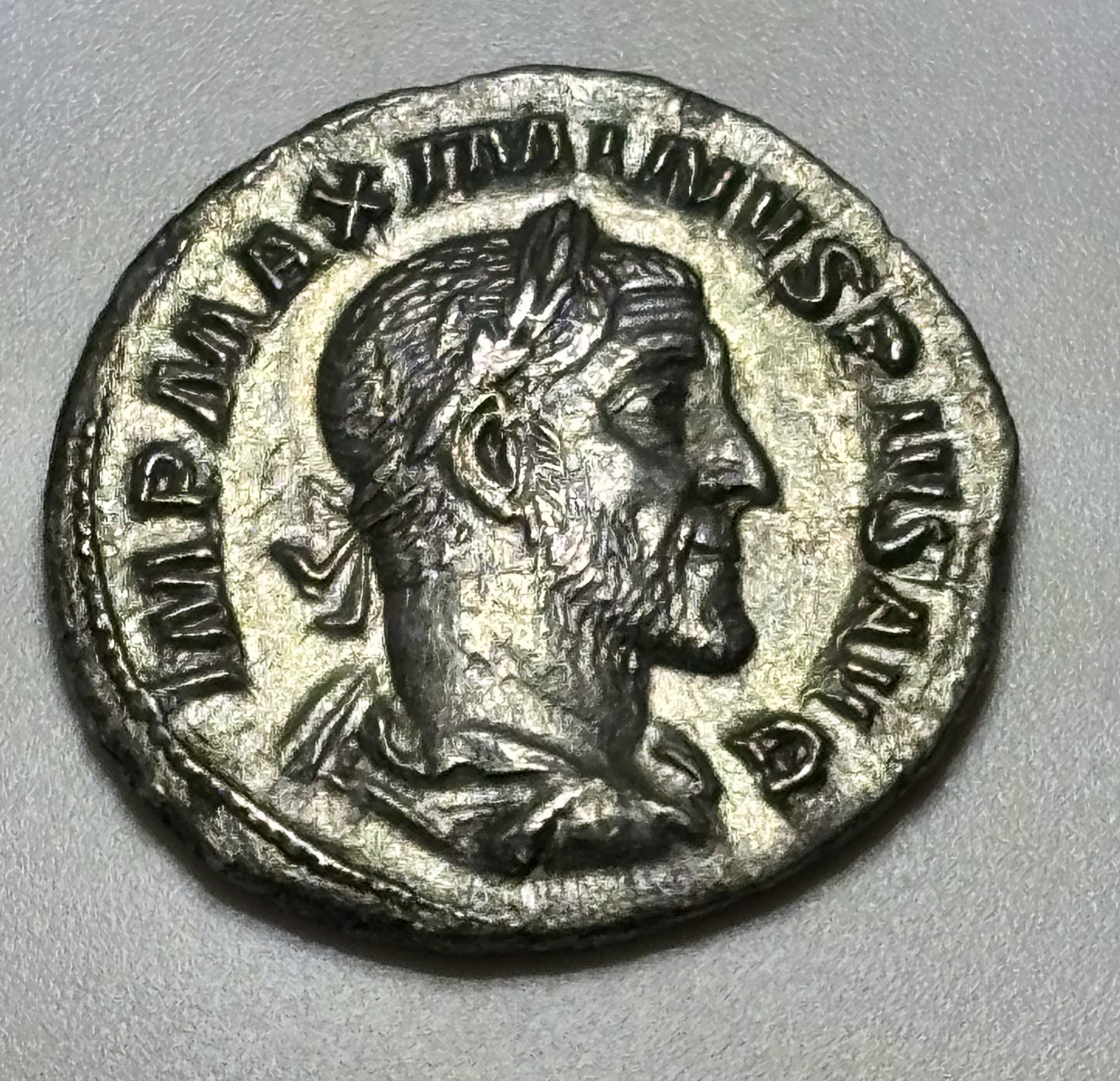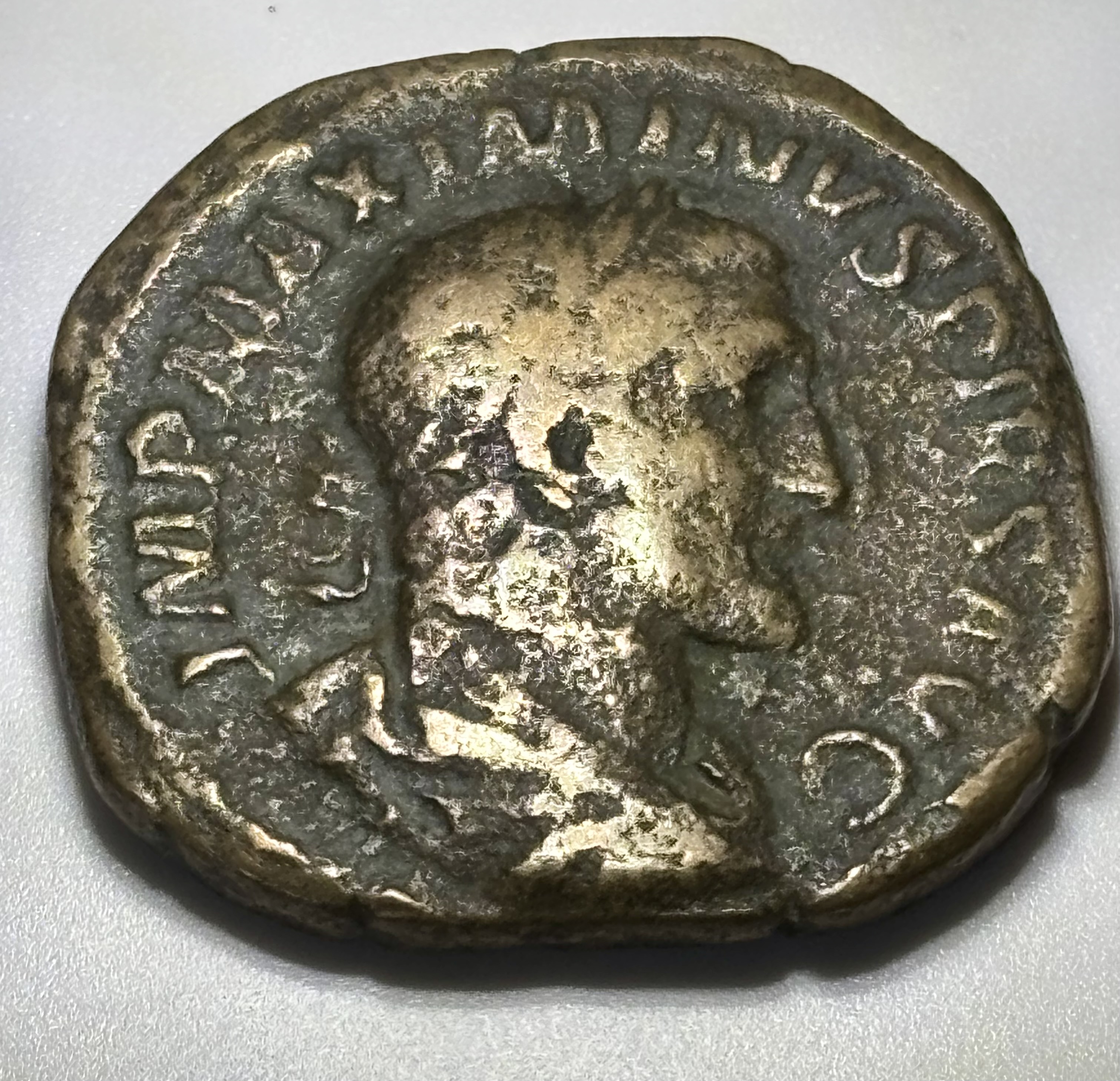 Ein massiver Sesterz des Maximinus Thrax, geprägt während seiner kurzen, militärisch geprägten Herrschaft. Das große Porträt und die detaillierte Rückseite unterstreichen seine Rolle als Heerführer.