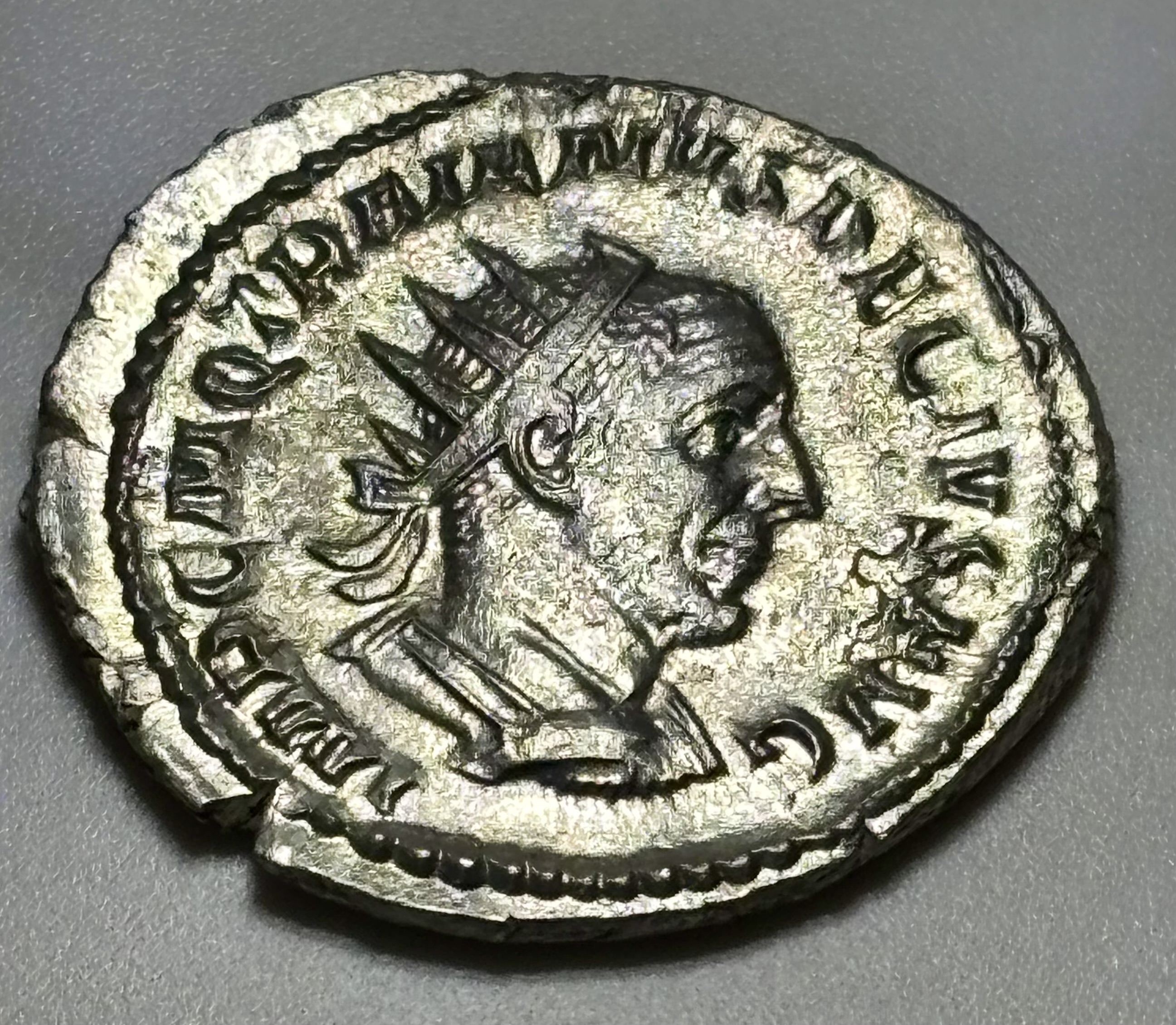 Ein prachtvoller Antoninian des Traianus Decius mit radiierter Büste. Die Rückseite zeigt den Genius des illyrischen Heeres, ein Hinweis auf die militärische Herkunft des Kaisers.