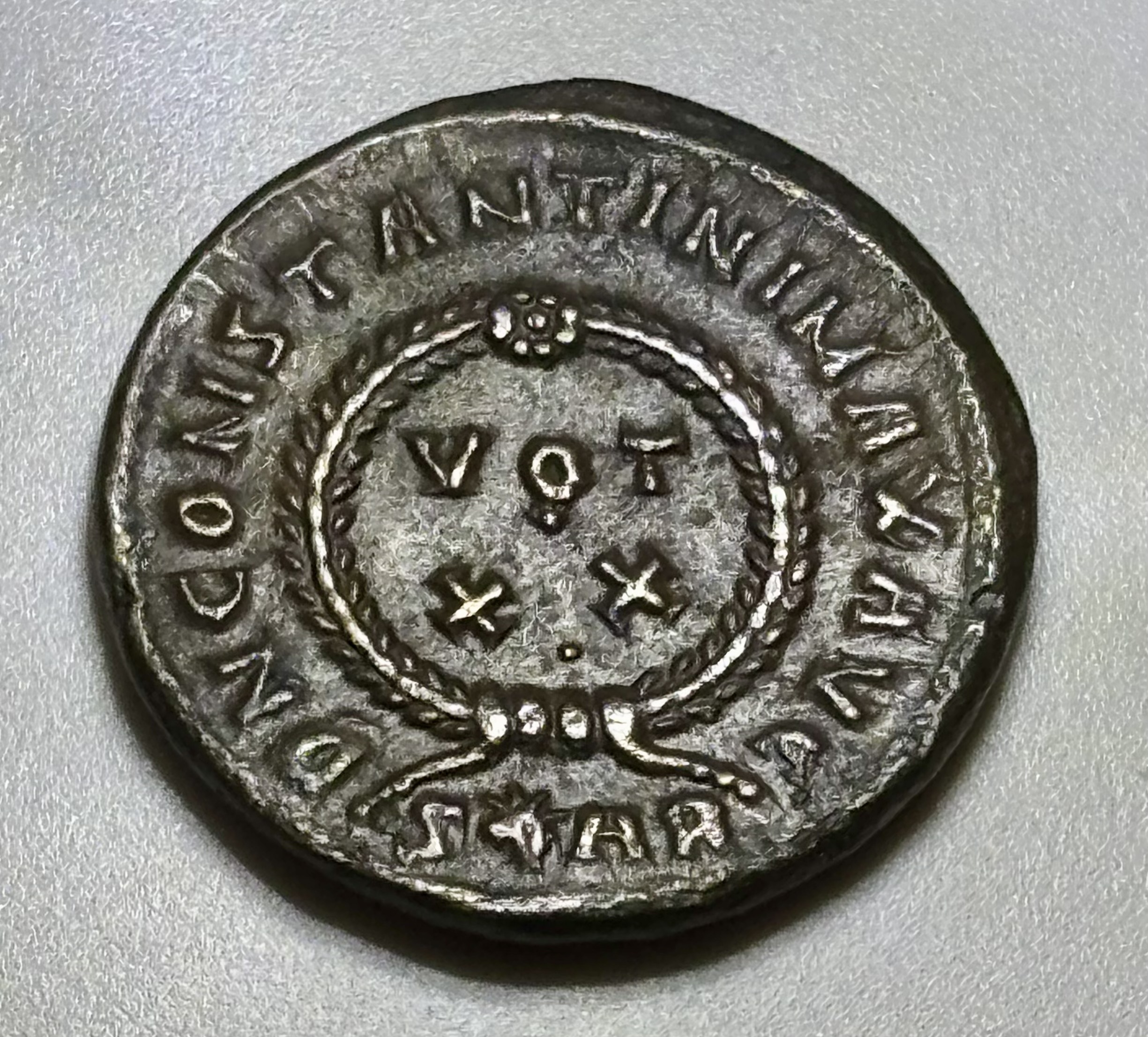 Ein Follis aus Arelate mit dem klassischen VOT‑XX‑Motiv, das Gelübde für 20 Regierungsjahre symbolisiert. Typisch für Constantins Münzreformen.