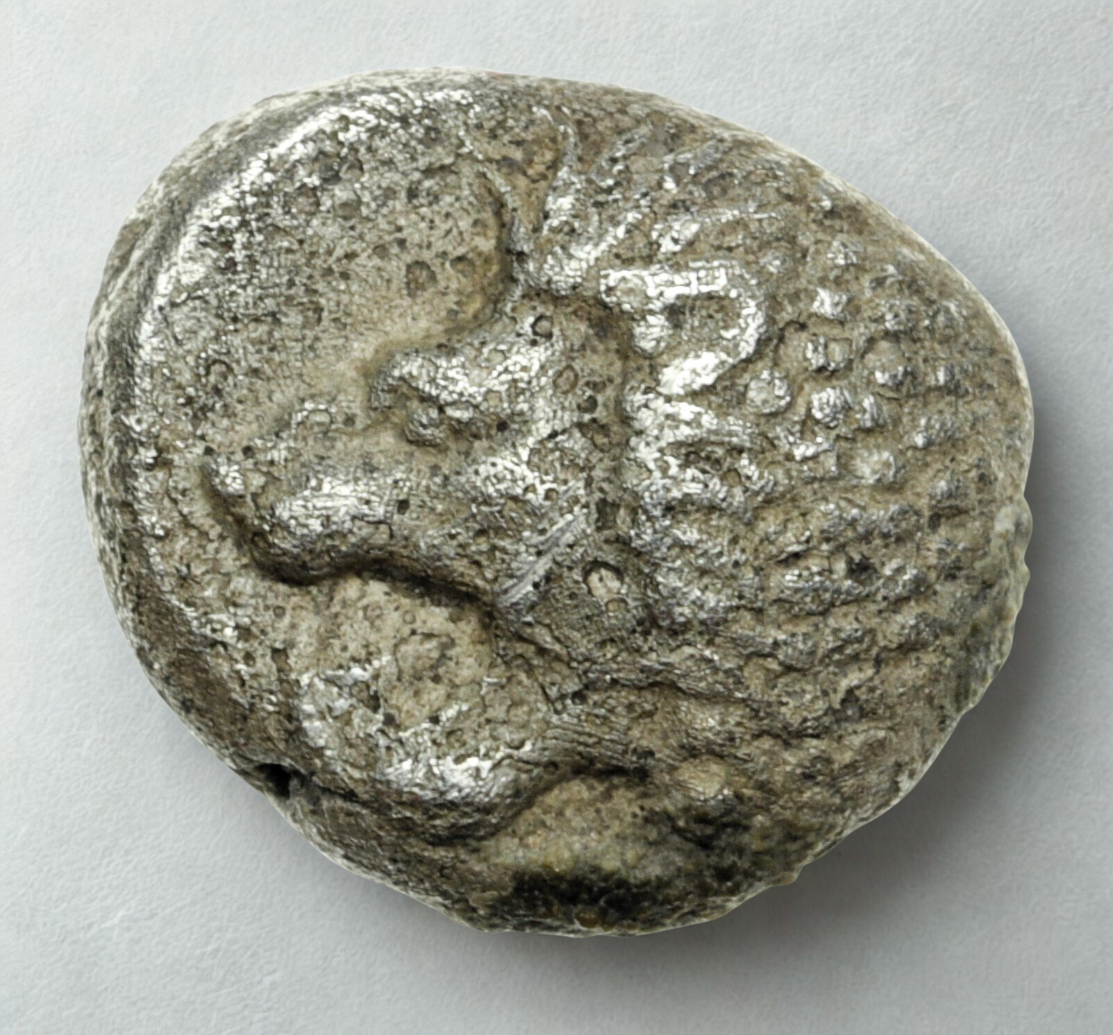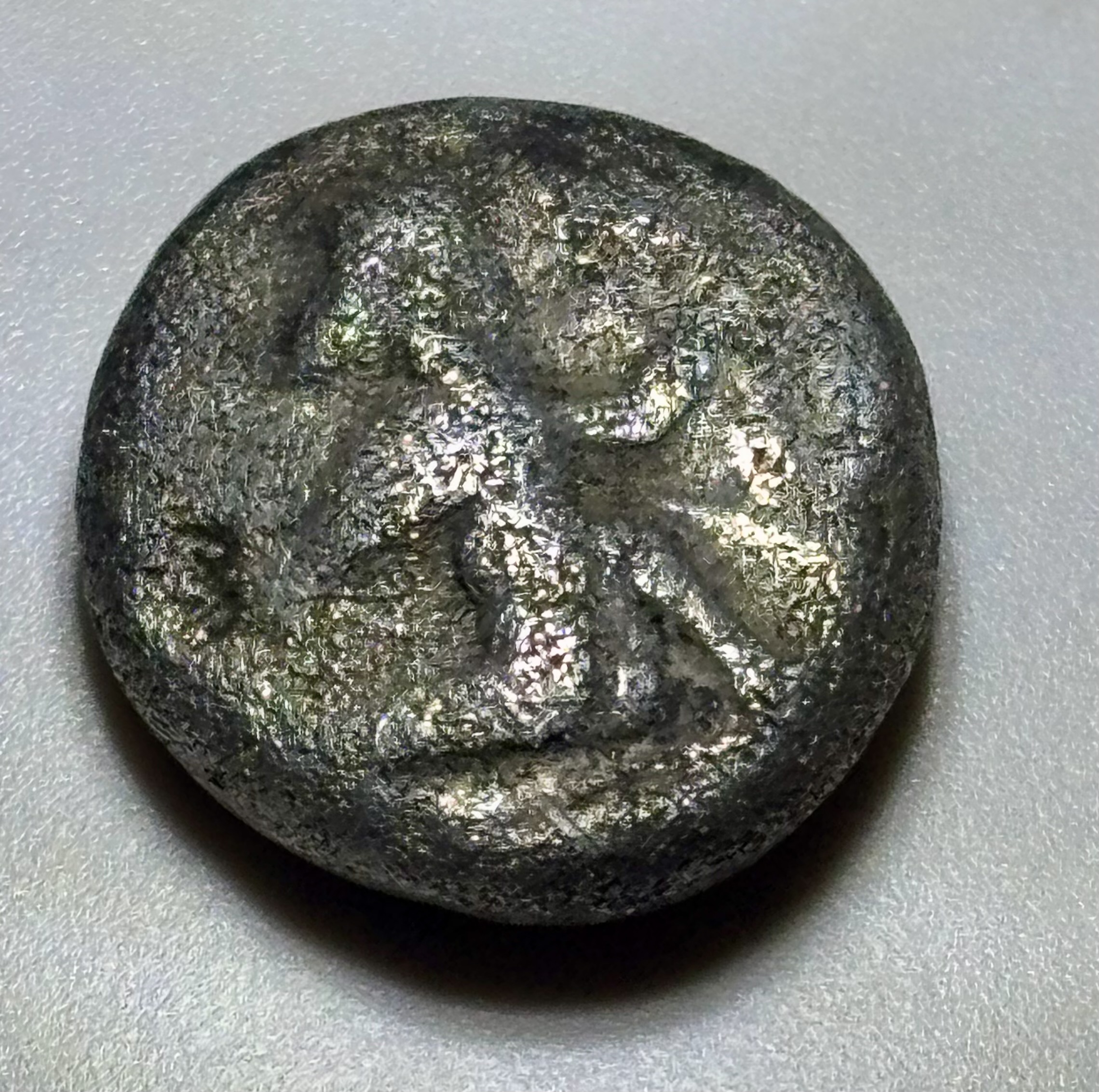 Ein seltenerer Diobol aus Milet mit dynamischer Darstellung des Löwen. Der Rumpf und die Vorderpfote sind nach rechts gerichtet, während der Kopf mit geöffnetem Maul kraftvoll nach hinten gewendet ist – ein eindrucksvolles Beispiel archaischer Tierdarstellungen. Die Rückseite zeigt ein sternförmiges Muster innerhalb eines vertieften Quadrats, typisch für die frühen milesischen Prägungen. Die Münze vereint Energie, Bewegung und die klare Symbolik der ionischen Frühzeit.