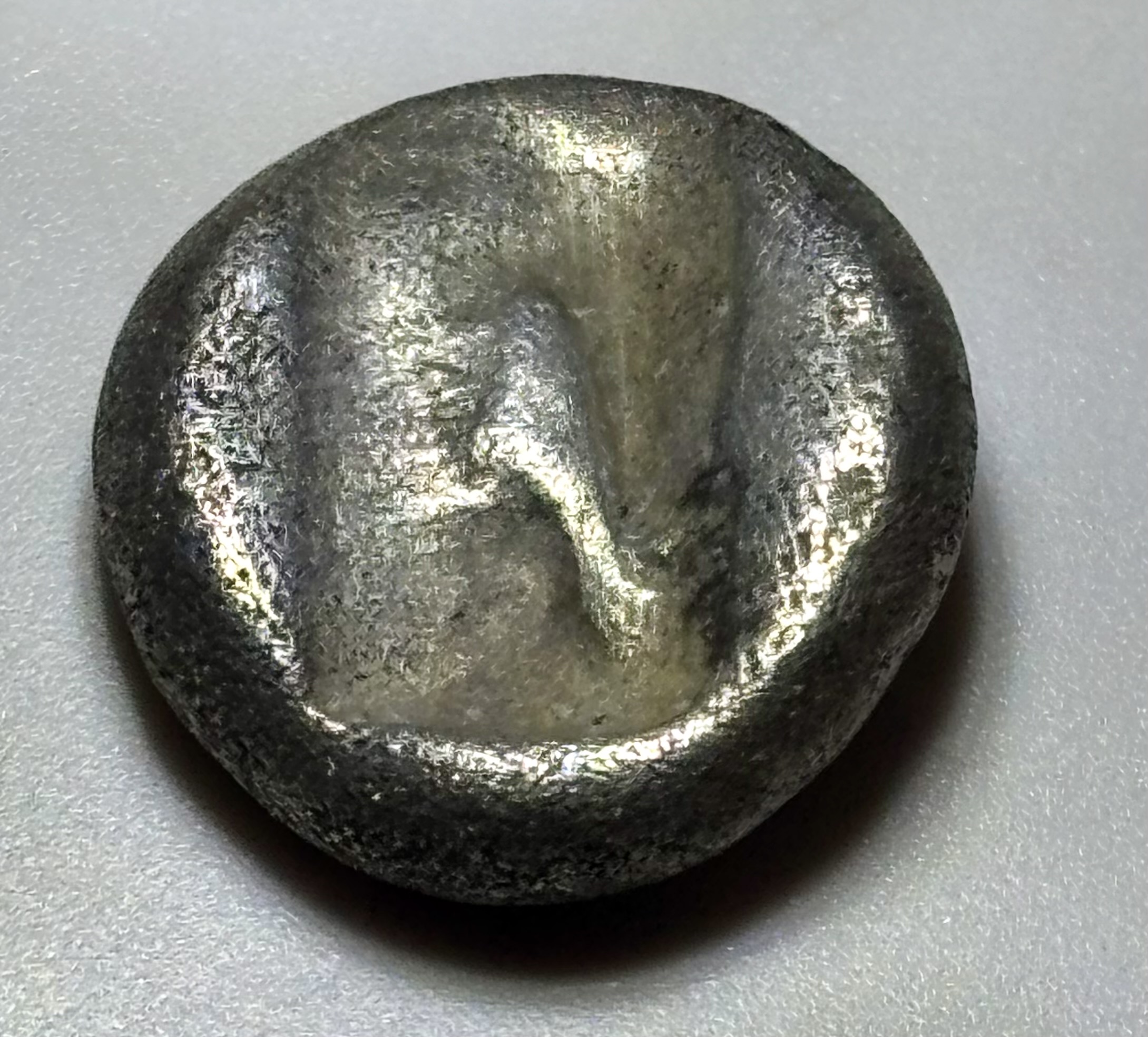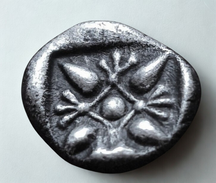 Ein früher Obol aus Milet, geprägt in der archaischen Periode Kleinasiens. Die Vorderseite zeigt den charakteristischen Löwenkopf nach rechts, ein zentrales Symbol der milesischen Prägung. Die Rückseite trägt ein sternförmiges Blumenmuster innerhalb eines tief eingeschnittenen Quadrats – ein typisches, streng geometrisches Motiv dieser frühen Elektron‑ und Silberprägungen. Die Münze verbindet rohe archaische Kraft mit der klaren Formensprache der ionischen Kunst.