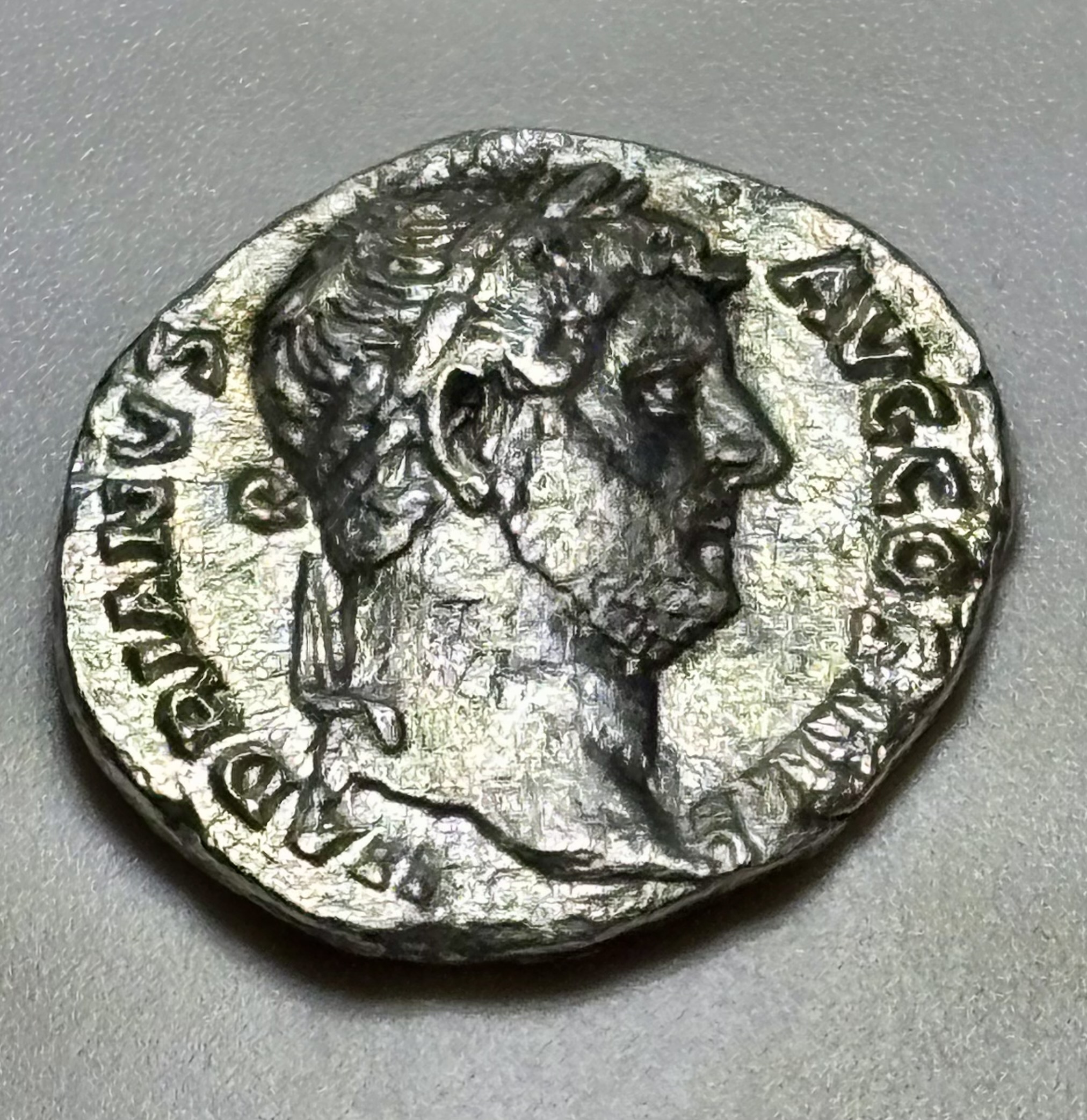 Ein Denar des Hadrian mit einer seltenen Darstellung der Fides Publica. Die Rückseite symbolisiert Treue und Versorgungssicherheit des römischen Volkes, ein häufiges Thema in Hadrians Münzpolitik.