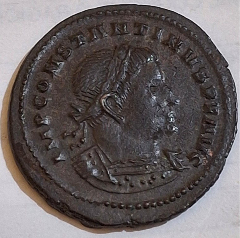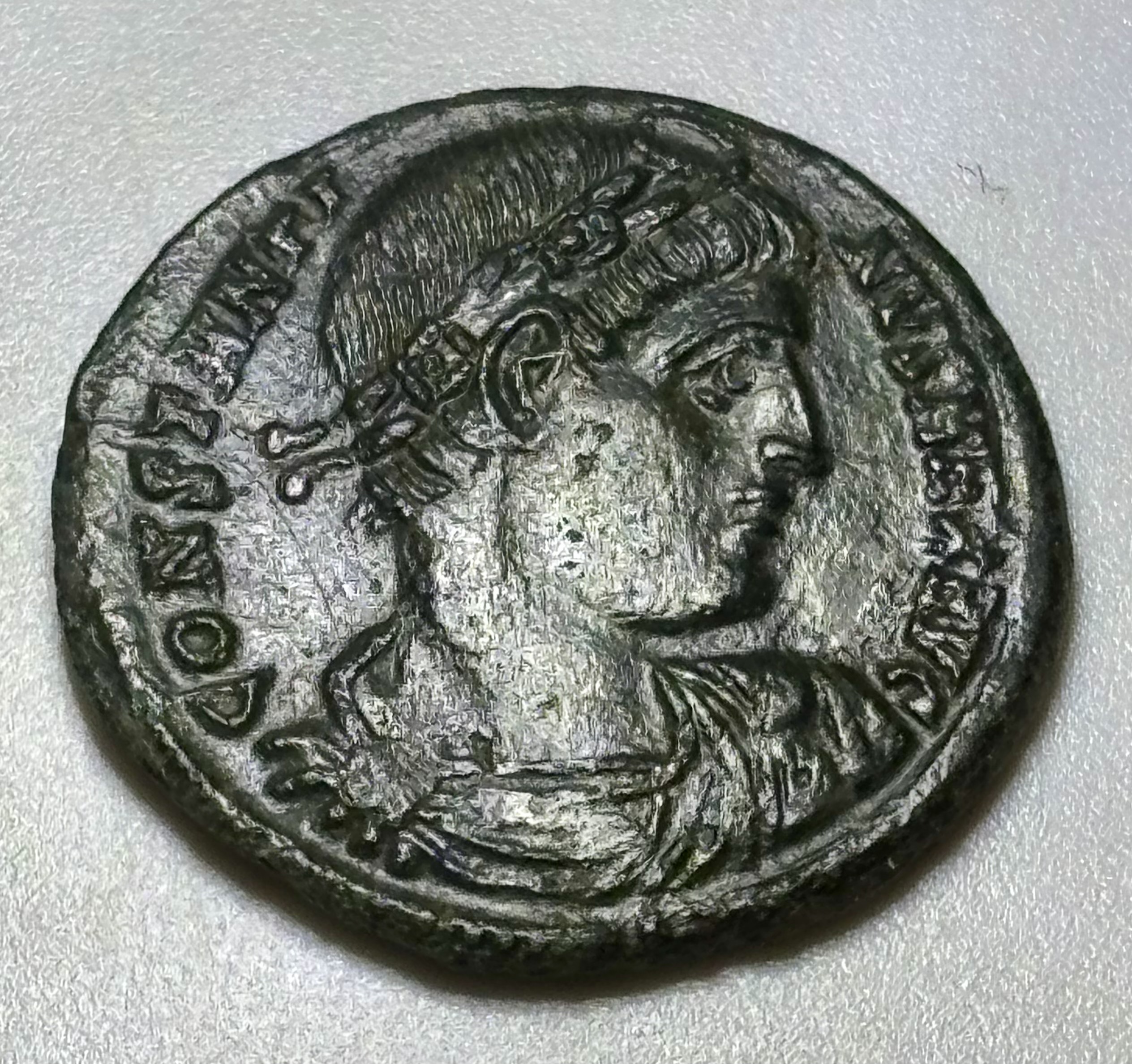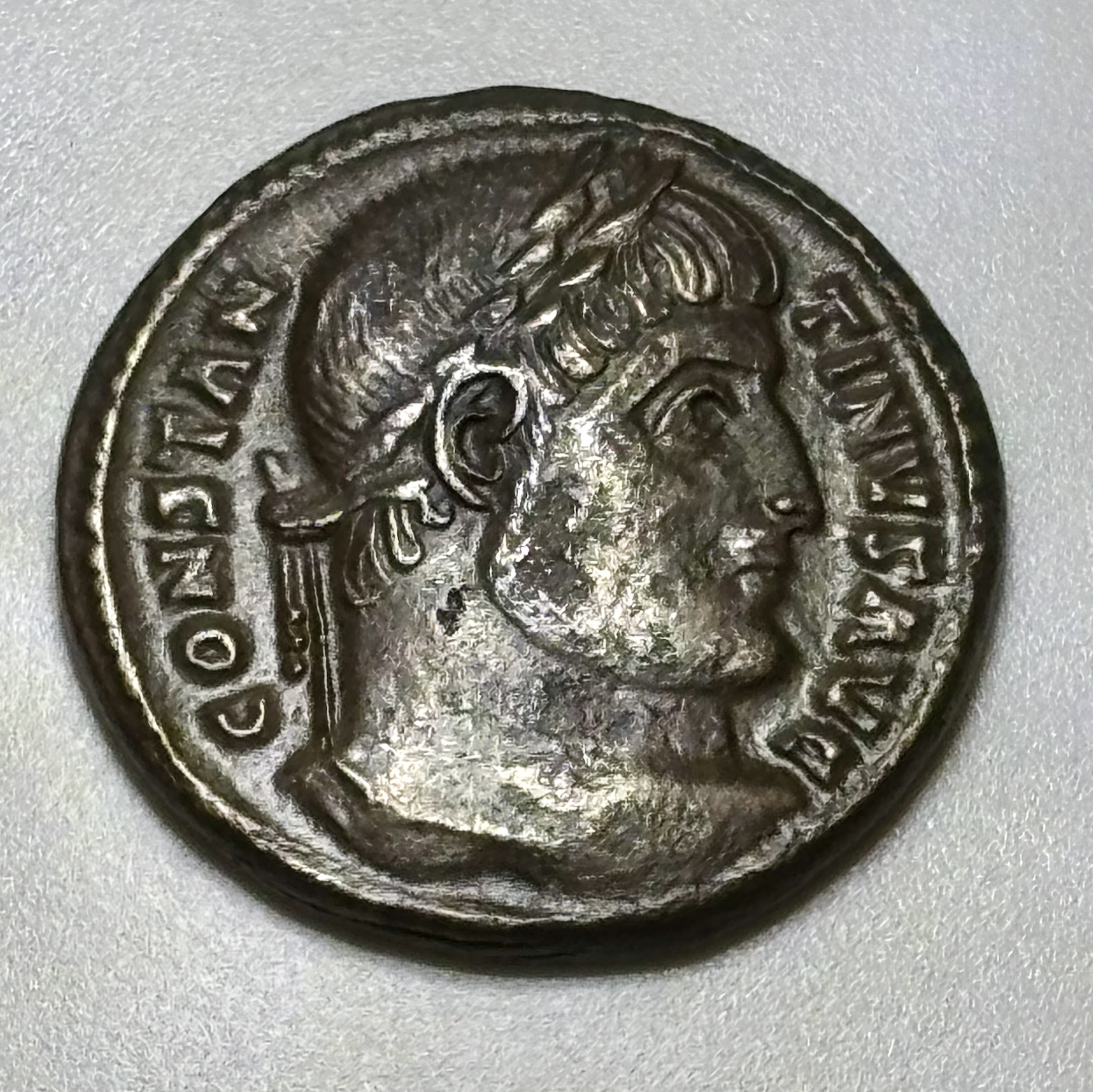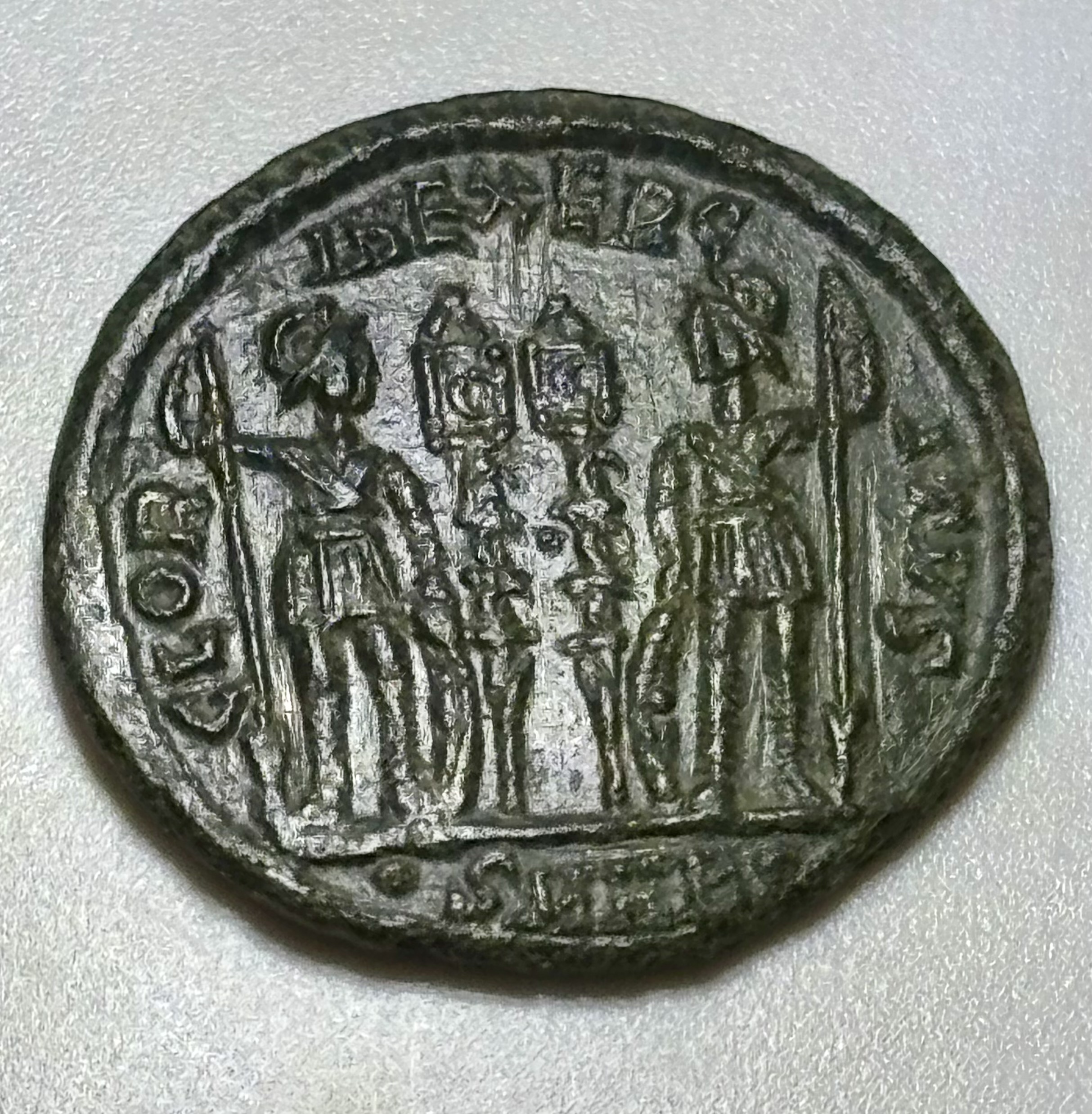 Ein Follis des späten Constantins mit dem bekannten GLORIA‑EXERCITVS‑Motiv. Zwei Soldaten flankieren die Standarten – ein Symbol für militärische Stärke und Einheit.
