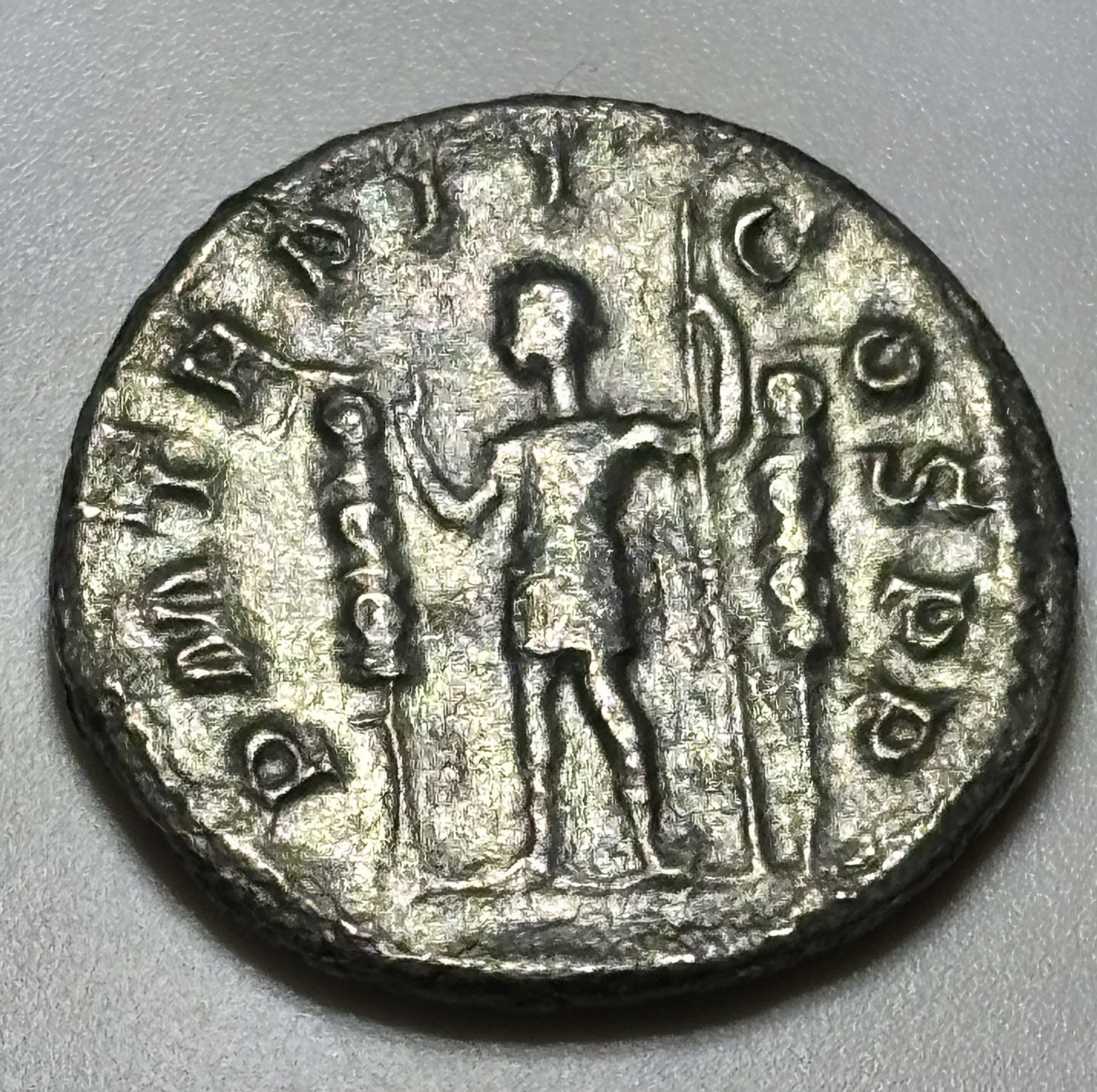 Ein hervorragend erhaltener Denar des Maximinus Thrax. Die Rückseite zeigt den Kaiser in militärischer Pose zwischen zwei Standarten – ein starkes Symbol seiner Machtbasis im Heer.