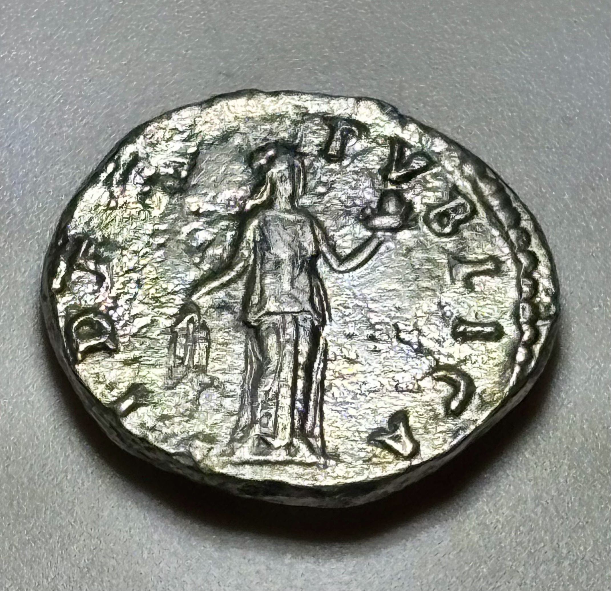 Ein Denar des Hadrian mit einer seltenen Darstellung der Fides Publica. Die Rückseite symbolisiert Treue und Versorgungssicherheit des römischen Volkes, ein häufiges Thema in Hadrians Münzpolitik.