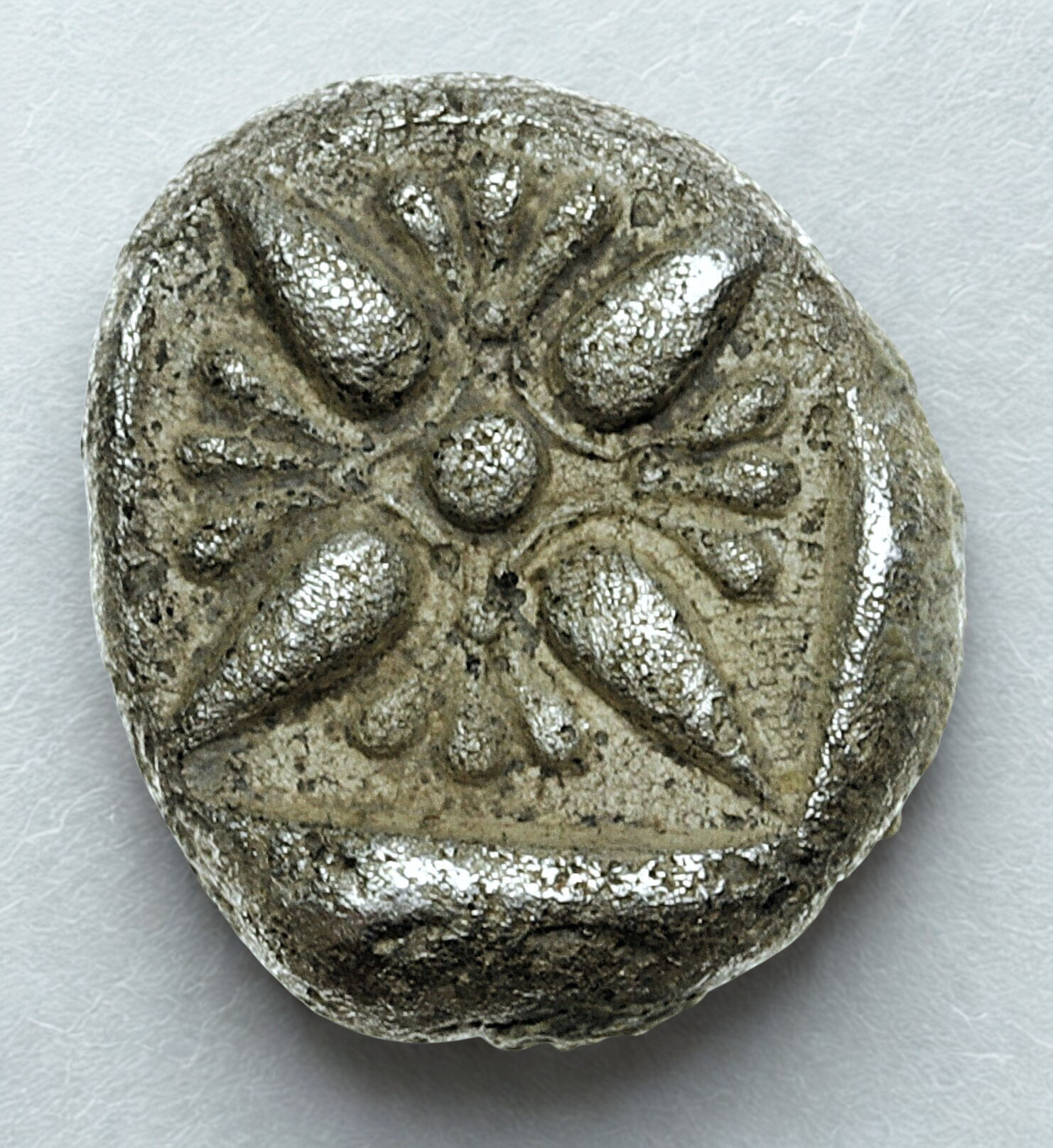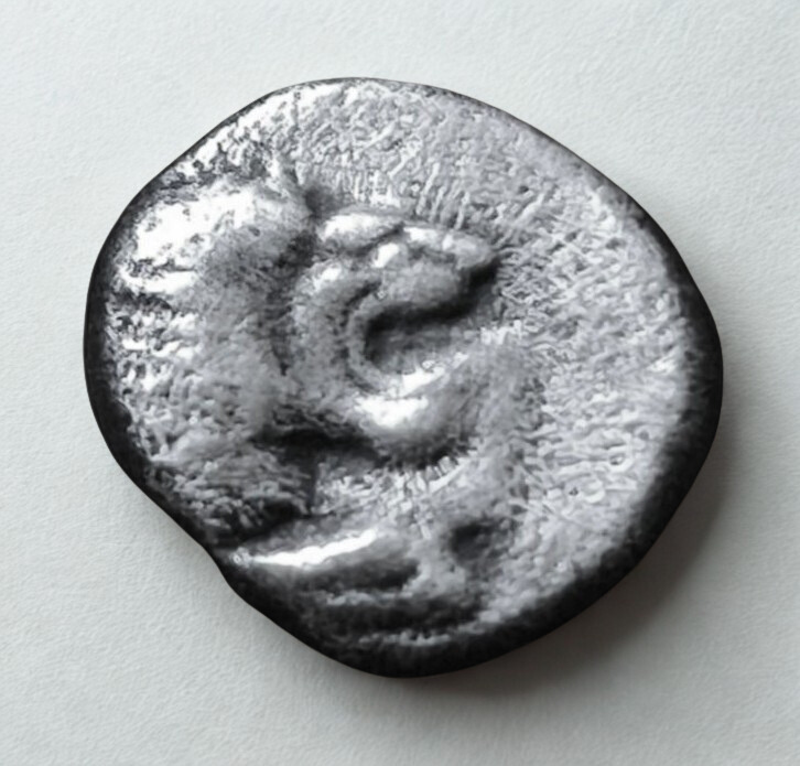 Ein früher Obol aus Milet, geprägt in der archaischen Periode Kleinasiens. Die Vorderseite zeigt den charakteristischen Löwenkopf nach rechts, ein zentrales Symbol der milesischen Prägung. Die Rückseite trägt ein sternförmiges Blumenmuster innerhalb eines tief eingeschnittenen Quadrats – ein typisches, streng geometrisches Motiv dieser frühen Elektron‑ und Silberprägungen. Die Münze verbindet rohe archaische Kraft mit der klaren Formensprache der ionischen Kunst.